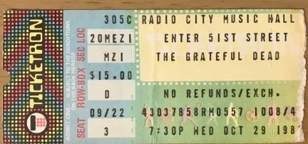 43 years ago, (wait, what?) when I was a 19 year old college sophomore, the Grateful Dead played an 8-night run at Radio City Music Hall, following a 2-week run at The Warfield in San Francisco (with a 2-night bridge between the coasts at Sanger Hall in New Orleans). It seemed like a grand adventure to drive back and forth two times in one week, 8 hours each way from upstate New York to Manhattan. Five of us ladies crammed our backpacks with some gauzy peasant skirts, genie pants, crystal jewelry, Chinese slippers, cigarettes, snacks and some study materials, along with a healthy dose of Orange Windowpane. We turned my housemate Stephanie’s late 60’s creampuff white Mustang with a red leather interior into a Deadhead clown car, and cassette deck loaded, we jetted down the NYS Thruway for the promised land.